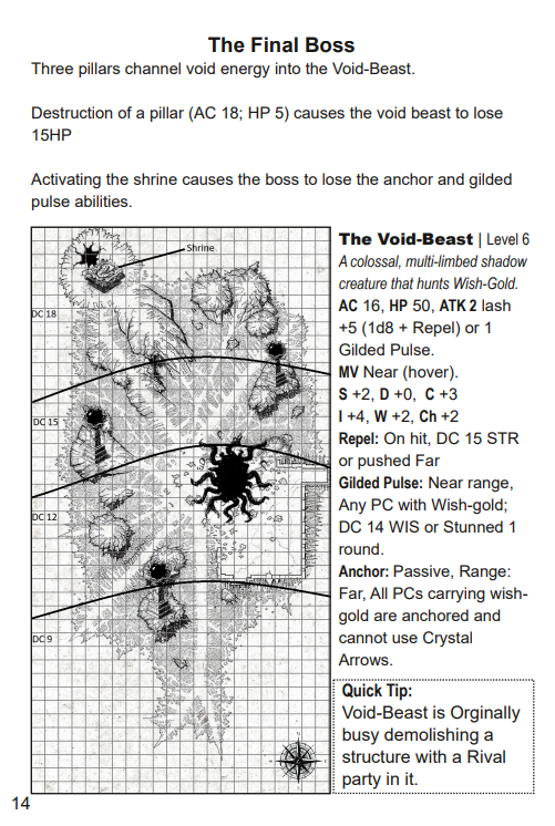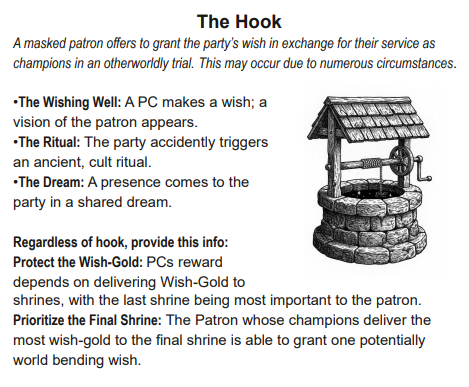 Player Characters (PCs) champion a patron in a highstakes cosmic ritual across nine regions. They must out survive NonPlayer Character (NPC) parties and deposit "WishGold" at celestial shrines before the void devours this dimension. PCs ride Crystal Arrows to the final gate and claim their wish from the jaws of the void.